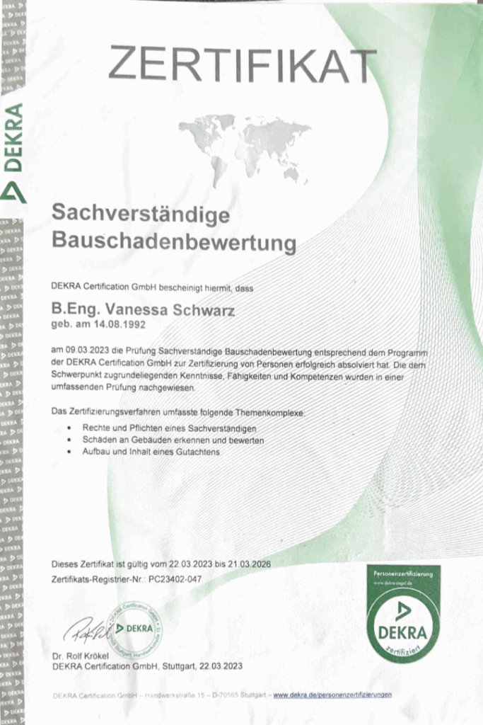 Im Jahr 2022 wurde ich durch die DEKRA als Sachverständige für Schäden an Gebäuden zertifiziert – ein weiterer Meilenstein in meiner fachlichen Spezialisierung.