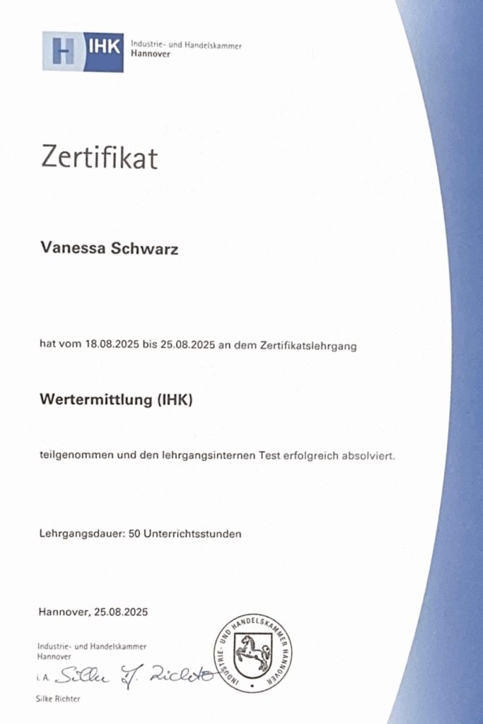 2025 belegte ich eine Weiterbildung zum Thema Immobilienwertermittlung und Restnutzungsdauer. In diesem Rahmen erwarb ich meine IHK-Zertifizierung zur Immobilienwertermittlerin. Diese bietet mir die Möglichkeit, qualifizierte Immobilienwertgutachten und Restnutzungsdauergutachten zu erstellen, und rundet mein Portfolio zur Beratung vor dem Kauf perfekt ab.